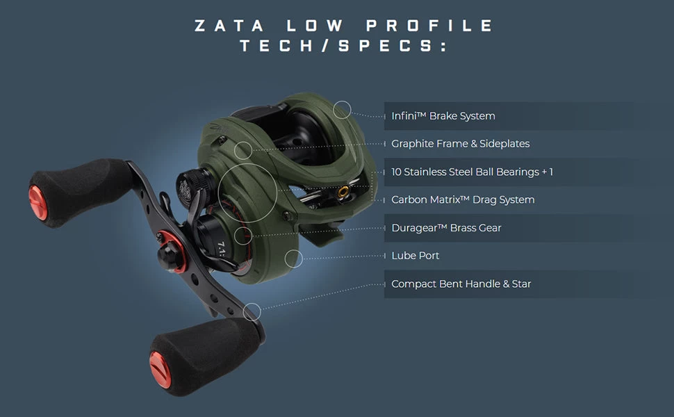 The ZATA low profile reels exemplify a sleek reel design in a compact package. Packed with features like 11 ball bearings and a Duragear brass gear, the Zata provides smooth casting and retrieval.