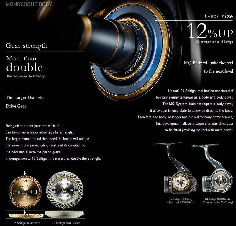 - Monocoque Body – MQ Body will take Saltiga to the next level. The MQ system does not require a body cover, instead using an engine plate to screw directly to the body. Eliminating the need for screws to hold a body cover in place. MQ body improves the strength of the reel, it also improves the water-resistance of the body and allows a larger diameter drive gear to be installed.