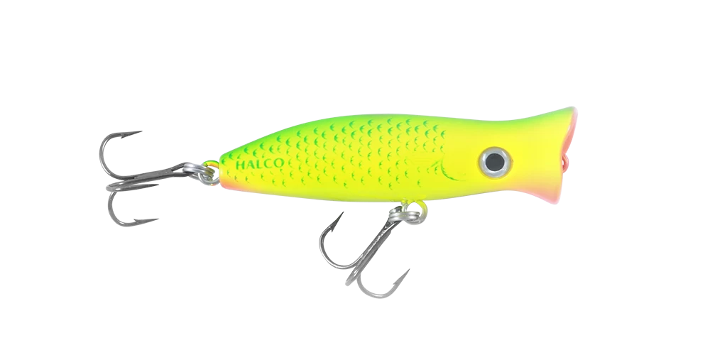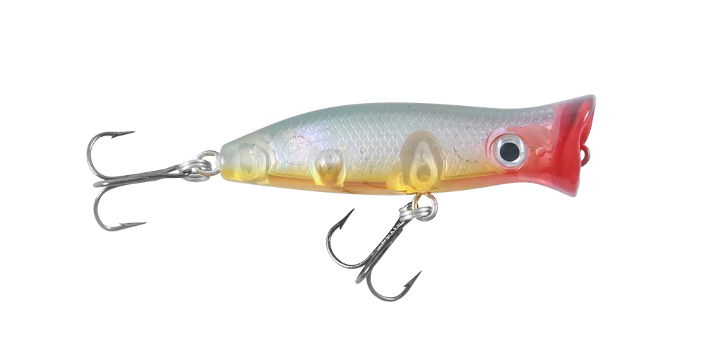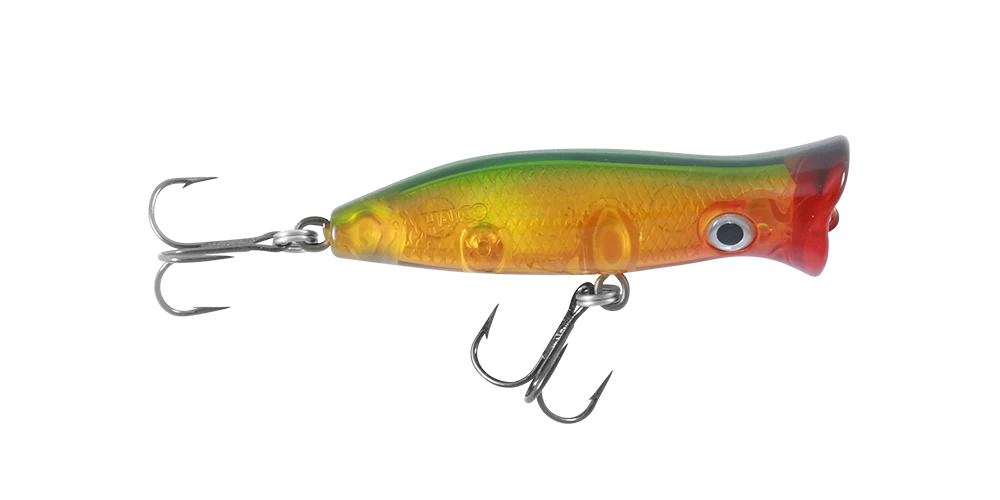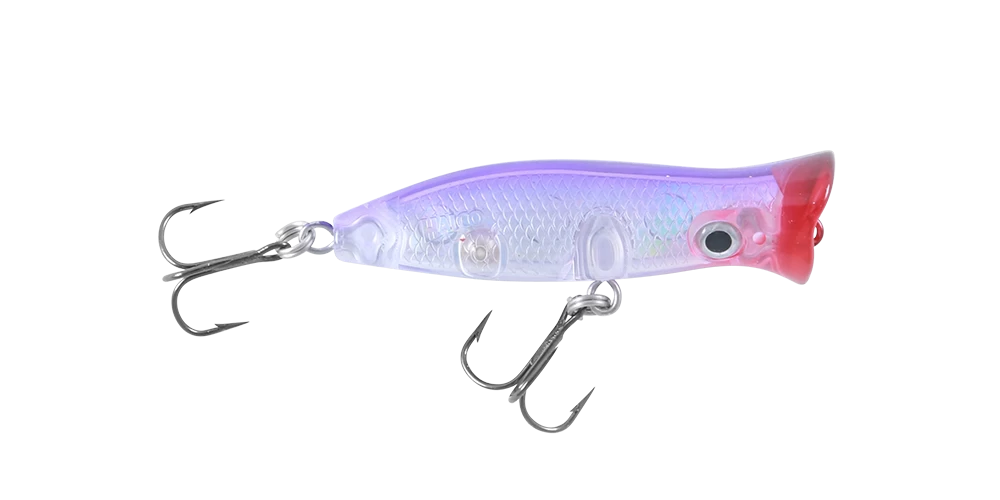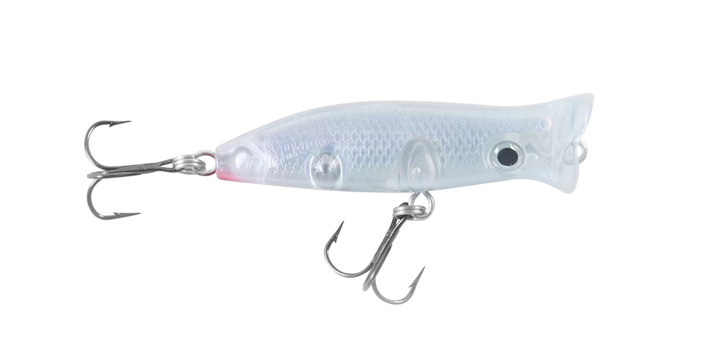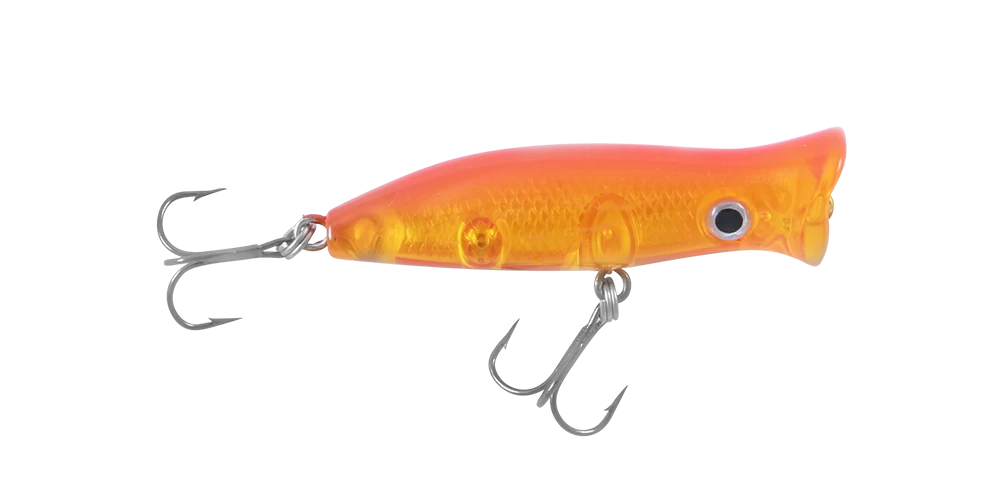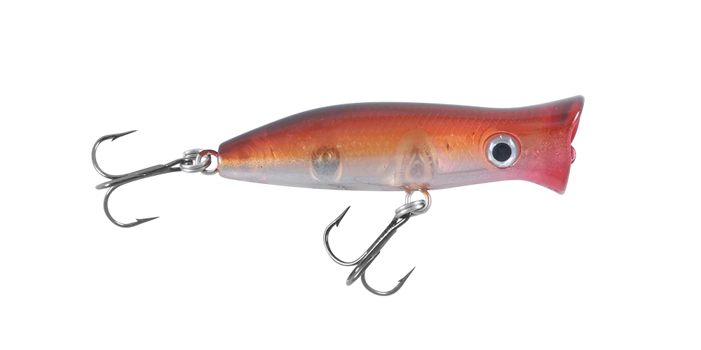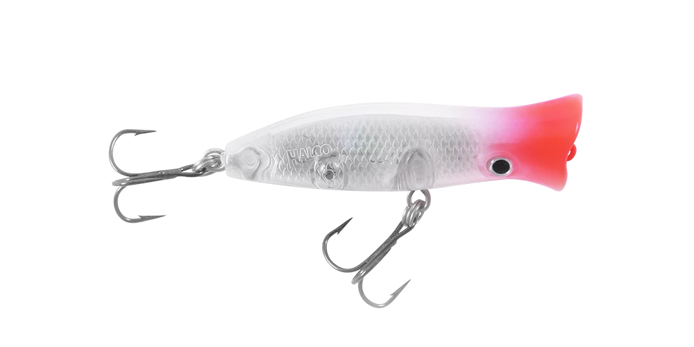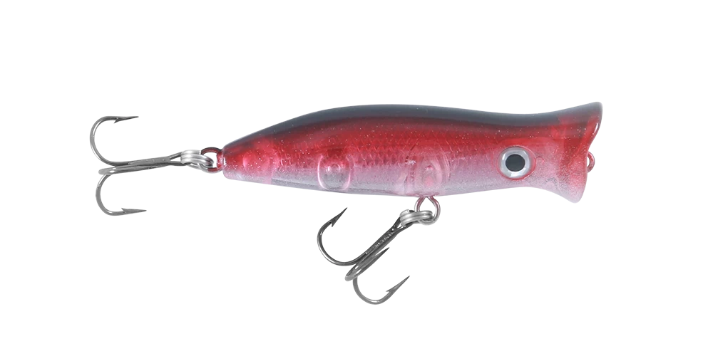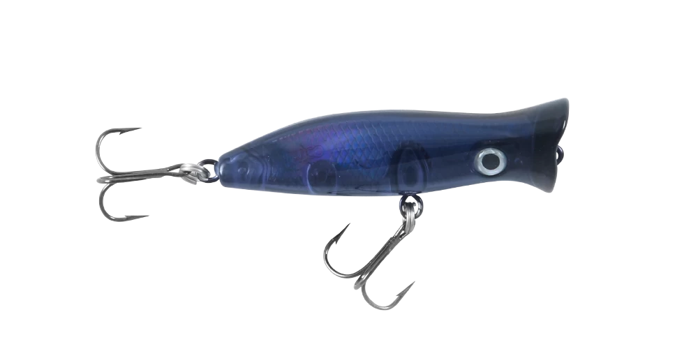 This surface action popper and blooper is rear weighted for long, accurate casting. When retrieved, the action can be altered by adjusting your rod tip height. The closer your tip to the water, the larger the bubble stream wriggles through the water. This can be particularly useful in rough surface conditions or high winds, where the lure needs to be kept in the water to minimize cart wheeling.