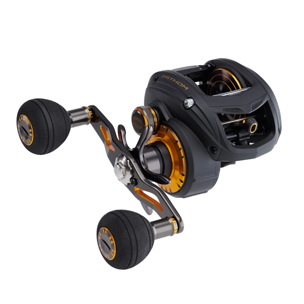 The PENN® Fathom low profile baitcast reels offer all the features you need to tackle the toughest saltwater fish. The Full Metal Body and Right Side plate, matched with a brass main gear and bearing supported pinion offer a drivetrain with unparalleled power, while the TiN Coated Level Wind System and Synchronized Drag and Level Wind system (*400 size only) give extra durability under high drags. Available in 200, 300 and 400 sizes with both standard and high speed gear ratios. Left hand models available in standard gear ratio only.