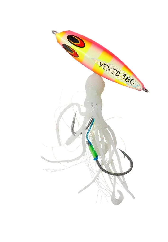 Next we improved the old school PVC octopus assist by using our own more durable, scented, super stretchy, high intensity UV/Glow Flashy Occy Head Assist. Add this Super Occy to our range of proven Vexed Bottom Meat colour patterns and you have the best Inchiku ever made. The DHU INCHIKU will catch many species including: Dhu Fish, Snapper, Groper, Coral Trout, Cod, Red Emperor, Cobia & King Fish – just to name a few!